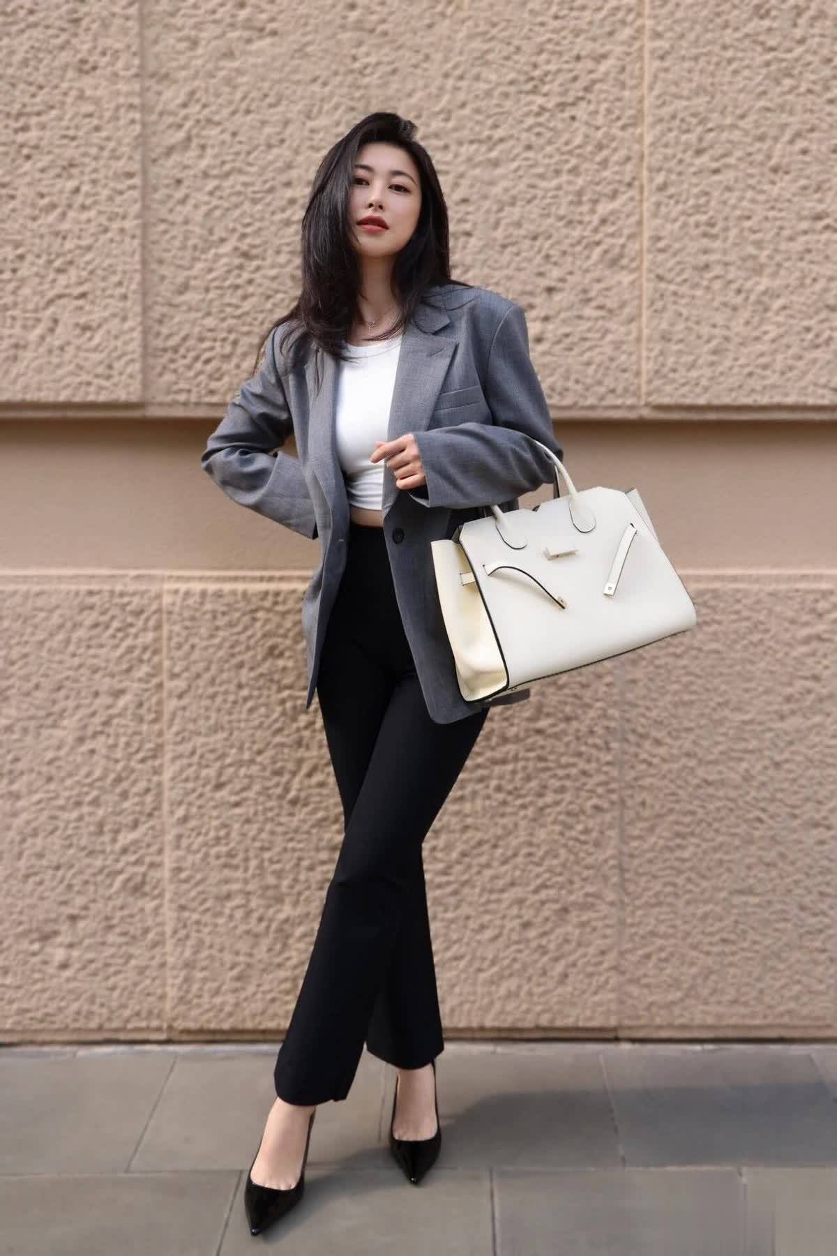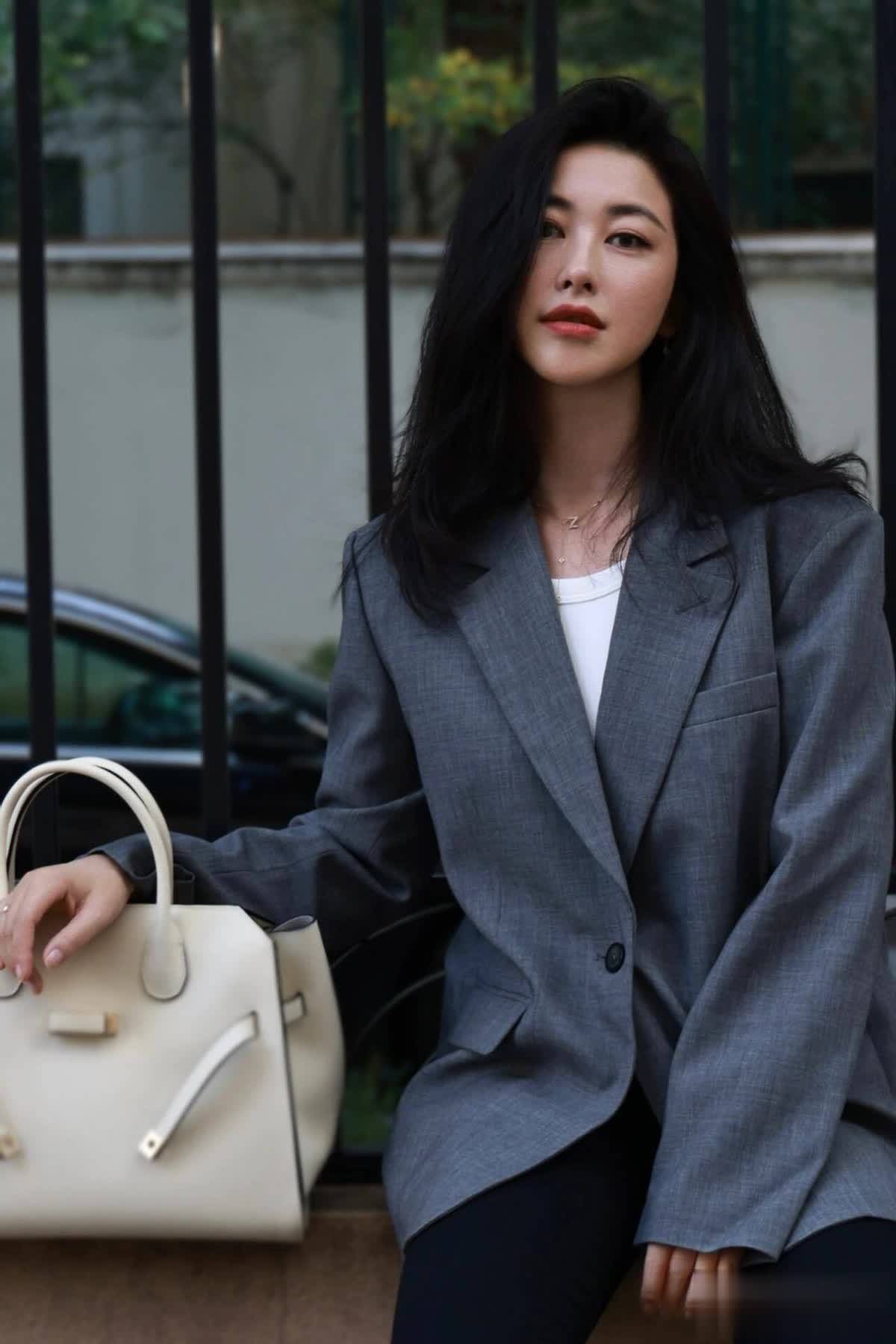 灰色西装搭配直筒裤是经典职场穿搭,干练得体。朱珠叠穿经典白T恤,层次感更强!