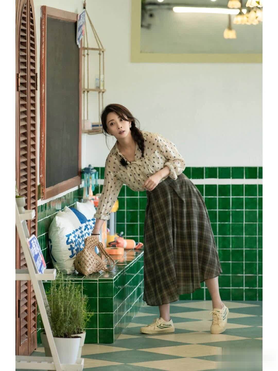 波点衬衫尽显女性甜美气质,搭配过膝裙,展现殷桃优雅气质。下半身过膝裙完美修饰腿部线条,让腿部更显纤细修长,美极了。